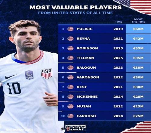 北京时间11月16日,德转列出了美国球员历史身价排名前10的球员,2019年身价曾经达到6000万欧元的普利希奇高居第一,吉奥瓦尼-雷纳4200万欧元第二,安东尼-罗宾逊和马利克-蒂尔曼同以3500万欧元并列第三。