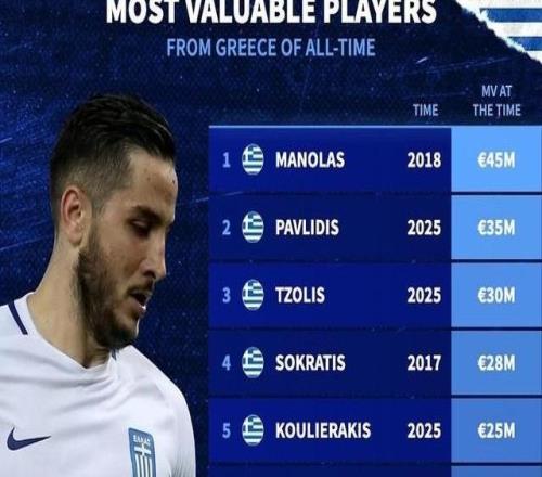 德转列希腊球员历史身价前10:马诺拉斯4500万第1,帕帕上榜 -